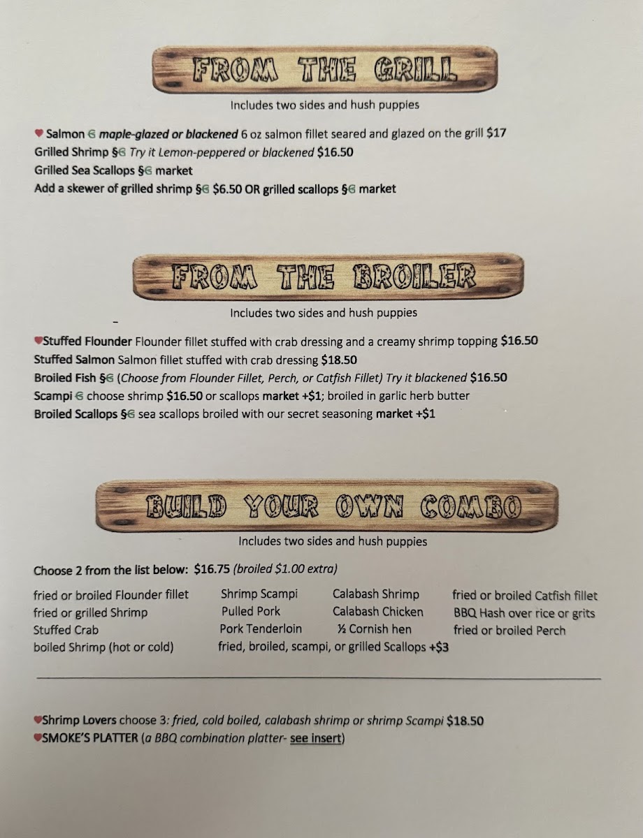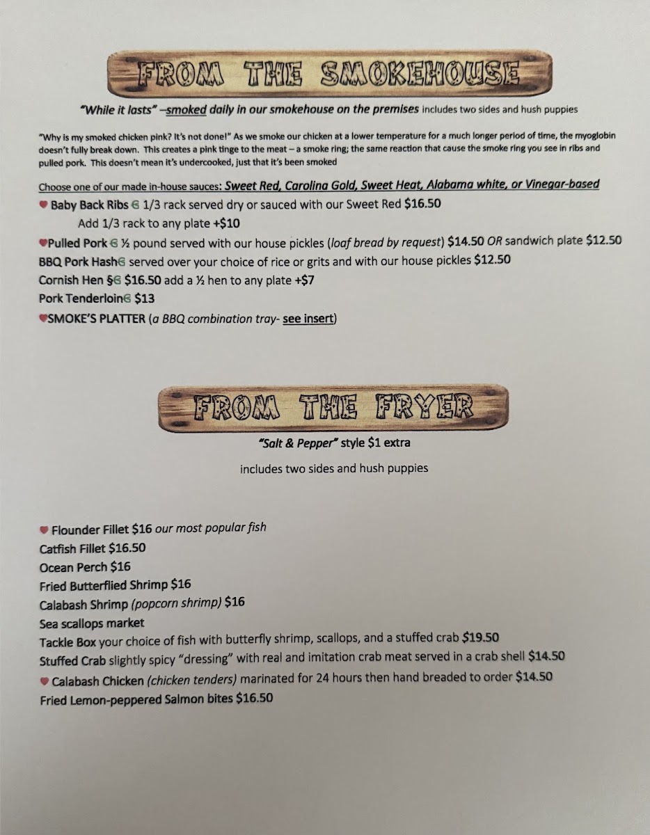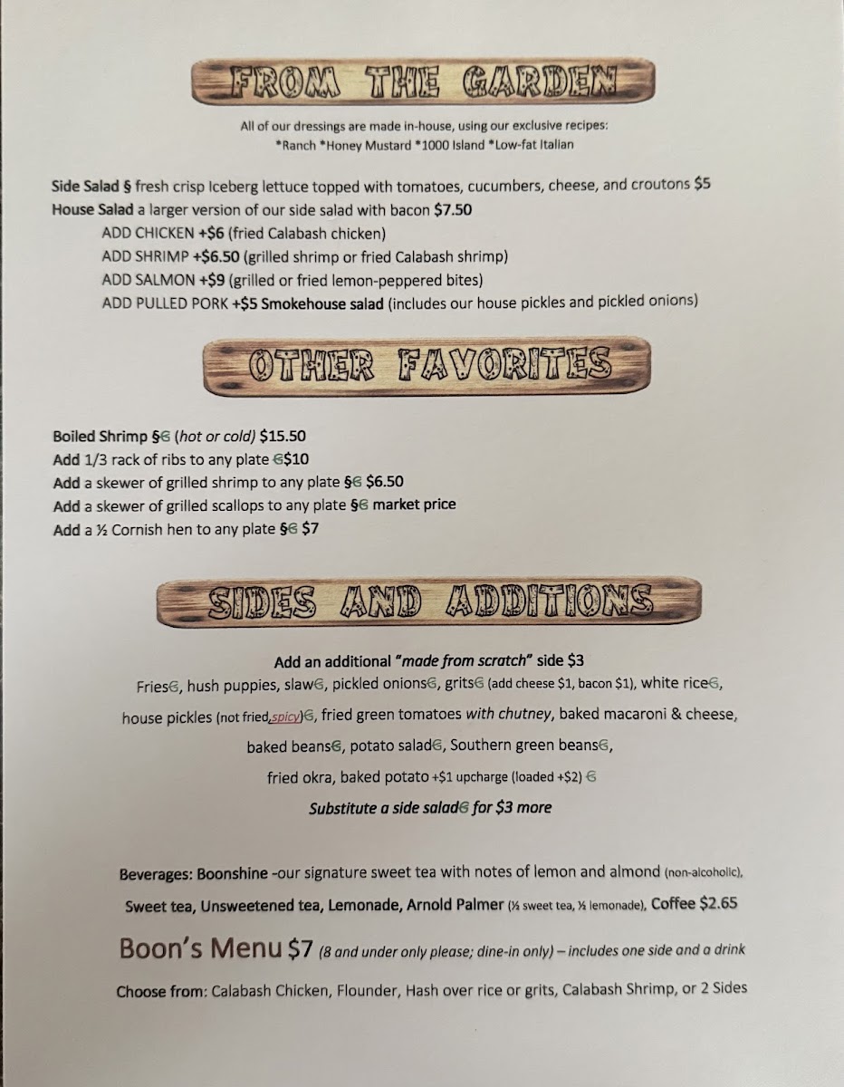 Guests can expect familiar favorites like slow-smoked ribs and pulled pork alongside seafood treats such as grilled shrimp and a fish and shrimp platter. Lighter sides from the garden balance the meal, with options like side salads and fried green tomatoes adding color and texture. Complementing these are comforting sides like baked beans, hush puppies, and crispy fries, which fit naturally with the warm, casual atmosphere.